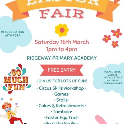 Meet the Easter Bunny, complete the Easter trail, learn to juggle, enjoy a slice of cake and much, much more! Open to all Ridgeway families, friends and neighbours. Free to attend, but please bring cash on the day as not many stalls will have card machines. Thank you